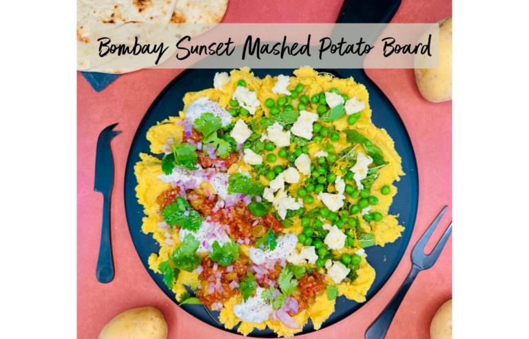 This board consists of mashed potatoes blended with curry powder and coconut milk and then spread on a board and topped with various Indian staples such as paneer cheese, tomato chutney, cucumber yogurt sauce, English peas, and mint.