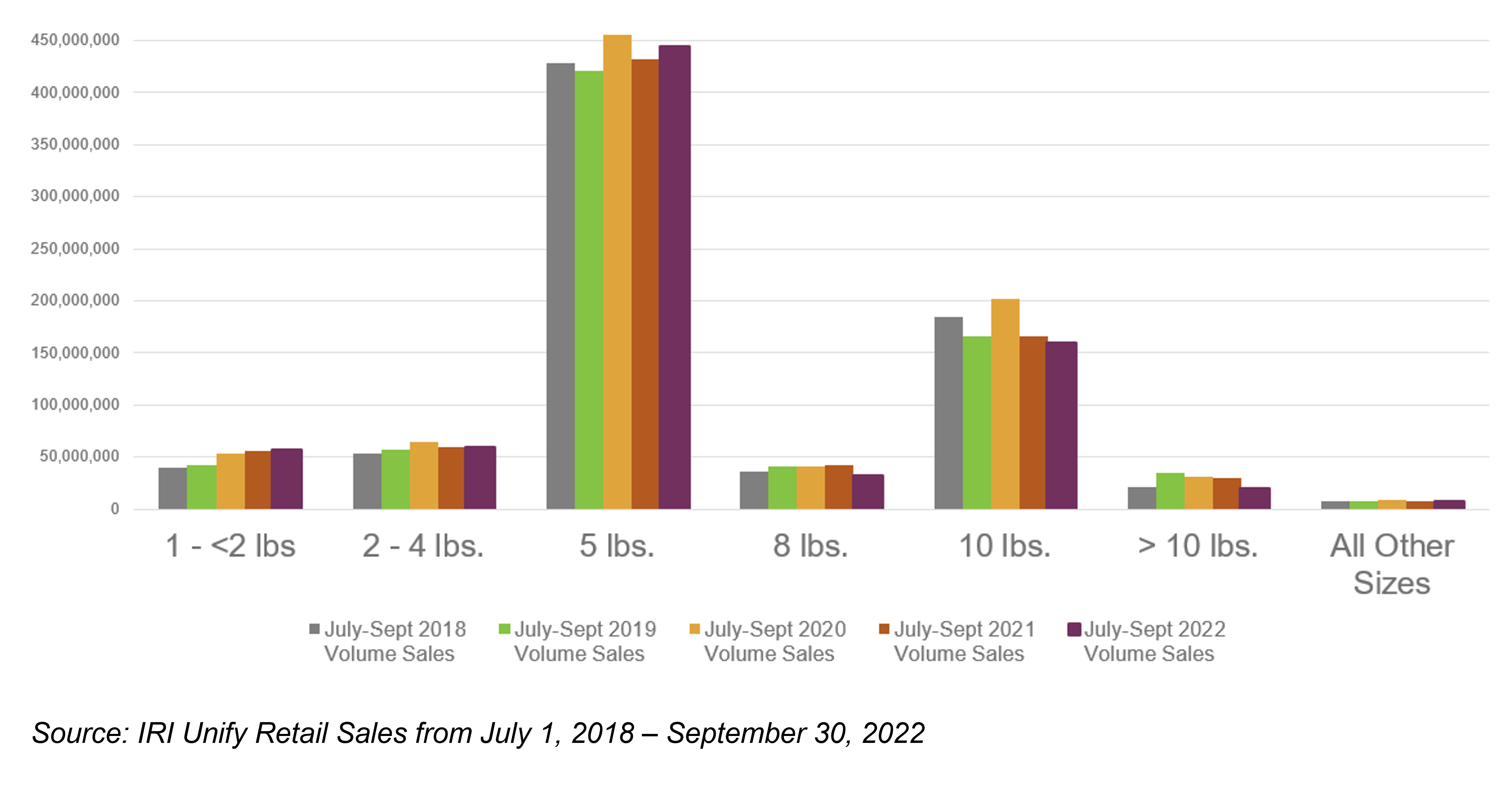 All pack sizes saw an increase in dollars, except packages greater than 10 pounds, which decreased -27.3%. The pack sizes that grew the most were five-pound and 10-pound packs, increasing by 29.4% and 29.3%, respectively. Volume sales of all pack sizes were down except for pack two- to four-pounds and five-pound bags.